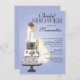Commencez votre élégante douche nuptiale avec notre invitation branchée de la mariée Brunette, avec une mariée Blonde classée, assise sur un élégant gâteau de mariage damassé à 3 étages, sur un arrière - plan bleu violet. customisez simplement notre invitation avec vos informations wedding showers et vous êtes tous prêts à partir. ©Illustrations JW