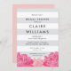 Les invitations à la douche à nuptiale à rayures florales chic présentent de larges rayures grises et blanches avec un ensemble de fleurs de pivoines aquarelles le long du fond en quartz rose vif et rose. Ajoutez les détails de votre douche nuptiale dans un élégant mélange de bloc et de lettres de script dans la coordination gris et noir. Cartes inversées à solide rose quartz rose.