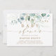 Cette invitation baby shower présente des eucalyptus peints à l'aquarelle, des feuilles de parties scintillant botanique vert et or avec script or.