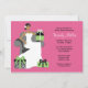 Invitation les invités pour une douche nuptiale dans le style avec cette invitation à la douche nuptiale moderne et amusante. Cette invitation rose et verte présente une mariée afro-américaine assise sur une chaise entourée de cadeaux.