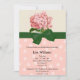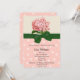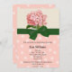 Une belle invitation à une belle mariée d'être ! Il est agrémenté d'une hydrangée rose en haut et d'un motif à points roses et blancs en bas. Un graphique d'un ruban vert et d'un arc séparent les deux. Tout le texte est personnalisable.
