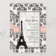 Jolie et sophistiquée invitation à la douche nuptiale à la parisienne avec une bordure florale damassée noire et blanche, design imprimé en ruban rose et la tour Eiffel sur elle. Conçu par Chrissy H. Studios, LLC.Tous droits réservés.