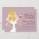 Une jolie mariée blonde aux yeux bleus toie sa famille et ses amis avec un verre de vin dans cette prise moderne sur invitation de la Douche nuptiale. Parfait pour une douche à thème ou pour une mariée qui aime le vin. arrière - plan mauve lilas doux avec texte brun. Egalement disponible :