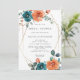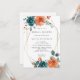 Invitation à la douche nuptiale à fleurs orange turquoise et brûlée. Elégante invitation à la douche nuptiale fleurie aquarelle avec de belles fleurs d'aquarelle peintes à la main disposées dans un bouquet dans les tons de rouille orange et turquoise foncé avec un cadre d'or géométrique parfait pour élégante douche nuptiale été et automne. Vous pouvez personnaliser le libellé, le style de police, la couleur et la taille devant et derrière l'invitation. Éléments correspondants disponibles.