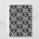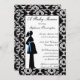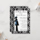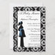 Ce invitation de baby shower 5x7 a un arrière - plan damassé noir et blanc. Il y a une silhouette d'une femme enceinte avec une fleur bleue dans les cheveux et une ceinture bleue. Vous pouvez facilement customiser les informations de votre parti à droite.