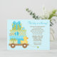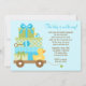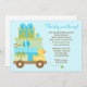 Cette jolie invitation au Baby shower comporte des cadeaux pour bébés bleus et un canard en caoutchouc dans un wagon. Cette invitation baby shower moderne et amusante est parfaite pour toute mère.