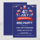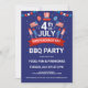 Feu d'artifice, drapeaux étoiles et bandes, ballons, invitation à une fête au barbecue, célébration de la fête nationale. Fond bleu et typographie personnalisable en blanc.