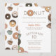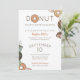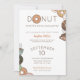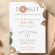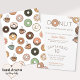 Cartons d'invitation pour une fête d'adieu avec un thème de beignets dessinés à la main et le titre humoristique "you donut want to miss this party" (vous ne voulez pas manquer cette fête), où le O de "donut" est illustré comme l'un des beignets colorés. Présentant une illustration numérique originale dessinée à la main avec des beignets au chocolat marron, glacés blancs, caramel marron, rose et vert menthe dans un style mignon et ludique, cette invitation convient parfaitement pour les fêtes d'adieu, les célébrations de départ, les départs en retraite au bureau, les rassemblements d'adieu de quartier et les fêtes pour enfants ou en famille. Le modèle éditable comprend des champs pour la date, l'heure, le lieu et les détails de RSVP afin que vous puissiez le personnaliser en quelques minutes. Disponible à la commande sous forme de