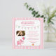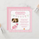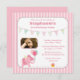 Ce super mignon invitation de fête d'anniversaire de 5,25 x 5,25 filles a un arrière - plan à rayures roses avec un éléphant tenant quelques ballons au milieu. Il y a aussi un cupcake et une bannière avec un endroit où ajouter votre propre photo. Vous pouvez facilement customiser les informations de la fête d'anniversaire au milieu. Certains éléments sont des graphiques de Lilly Bimble sur MyGrafico