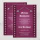 Une invitation d'anniversaire en clôture rose foncé qui a deux epees en haut de l'invitation et des dessins en diamant sur le côté. L'invitation a l'air médiévale avec une police noire, idéal pour une fête d'anniversaire de chevalier.