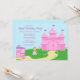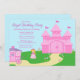 Ce invitation de fête d'anniversaire de 5 x 7 filles a un thème de princesse royale. Il y a un château rose chaud dans la arrière - plan avec une route bordée de fleurs roses et bleues à l'avant. Sur la gauche, une princesse aux cheveux blonds se tient près d'une calèche qui descend la route. En haut à gauche, vous pouvez facilement customiser les informations sur la fête. © 2012 Illustrations Jessica Weible/JW
