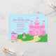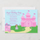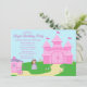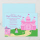 Ce invitation de fête d'anniversaire de 5 x 7 filles a un thème de princesse royale. Il y a un château rose chaud dans la arrière - plan avec une route bordée de fleurs roses et bleues à l'avant. Sur la gauche, une princesse aux cheveux bruns se tient près d'une calèche qui descend la route. En haut à gauche, vous pouvez facilement customiser les informations sur la fête. © 2012 Illustrations Jessica Weible/JW