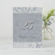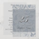 Un élégant motif floral vintage en damas argent et gris-bleu est le fond de cette jolie invitation formelle pour la célébration de l'anniversaire de mariage d'argent. Un champ transparent assorti contient le numéro stylisé 25 et les prénoms du couple en texte gris foncé. De fines lignes argentées bordent le champ transparent, illuminant l'avant et attirant l'attention sur vos informations. Le verso de l'invitation est d'un gris clair assorti, avec votre texte personnalisé dans un gris plus foncé assorti.