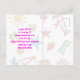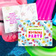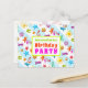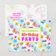 Carton d'invitation pour une fête d'anniversaire en été. Ce design tropical est parfait pour la fête d'une adolescente, ou pour une fête à la piscine de fin d'année scolaire. Le texte aux couleurs vives correspond au design amusant de l'été qui comprend des images de lunettes de soleil, de tongs, d'étoiles de mer, de palmiers, de coquillages, et plus encore imprimées sur des rayures bleu clair et blanc. Le recto comporte trois lignes à personnaliser avec la mention « Vous êtes invité à une fête d'anniversaire » et un autre modèle de texte au verso pour les informations sur la fête. Tout le texte est facile à modifier pour n'importe quel type de fête.