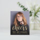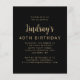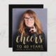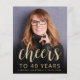 Le recto de cette invitation pour un 40e anniversaire présente la photo de l'invité d'honneur avec un texte superposé de couleur or. Le mot "cheers" apparaît dans une élégante écriture calligraphique de couleur or, suivi de "to 40 years" et du nom de l'invité d'honneur et de sa date d'anniversaire dans une police sans empattement. Un écran sombre aide à faire ressortir le texte. Personnalisez le verso avec le nom et les détails de la fête sur fond noir. Une excellente façon de célébrer quelqu'un qui fête ses quarante ans !