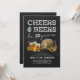 Cartes d'invitation pour une fête d'anniversaire rustique pour adultes de 50 ans avec un fond de tableau noir, une sélection de bières à l'aquarelle, un bretzel et un tonneau de bière, la phrase "à la santé et à la bière pour 50 ans" et un modèle de fête moderne facile à personnaliser.