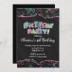 Invitation de fête d'anniversaire à la table d'honneur branchée et moderne pour une fête d'anniversaire, ado. Notre mignonne invitation à l'anniversaire est faite de bouquet bleu, jaune, rose et violet avec des doodles à la craie posés sur un arrière - plan en damier noir.