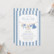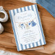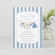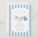 Célébrez l'arrivée joyeuse de votre petite fille avec notre invitation à la fête de bébé "Blue Jean Baby". Cette carte charmante présente des détails en denim doux comme des vêtements de bébé mignons et des rayures tendance en arrière-plan.