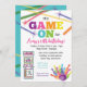 Notre invitation de fête d'anniversaire Game On Arcade, originale et best-seller, est l'invitation parfaite pour toute fête sur le thème du jeu avec un thème arcade, laser tag ou bowling. Ce design présente des lettres colorées avec des graphismes amusants de jeux d'arcade, de boule et de quilles de bowling, et de faisceaux laser.