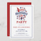 Invitation à la fête des symboles de la fête de l'indépendance avec texte personnalisé en rouge et bleu sur fond blanc. Nourriture, plaisir et feux d'artifice.