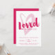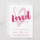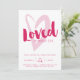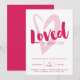 Une invitation pour une fête de la Saint-Valentin à la maison ou à l'église, ou pour un événement pour les jeunes ou les dames à l'église. Ce design typographique moderne présente un cœur rose clair dessiné à la main sur lequel est superposé le mot "Aimé" en police écrite brosse rose fuchsia et la référence biblique Jérémie 31:3 sur fond blanc. Le verso est en rose fuchsia uni.