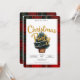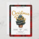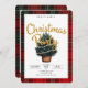 Cette carte est pour une invitation à la fête de Noël. Il présente un design festif avec une bordure en plaid aux couleurs traditionnelles de Noël, rouge, vert et noir. Au centre, il y a une illustration d'un arbre de Noël décoré de lumières à cordes douces et brillantes. Le texte dit **"Rejoignez-nous pour une fête de Noël"** en caractères d'or gras. Sous l'arbre, les détails de l'événement sont clairement indiqués, y compris la date et l'emplacement. Les informations du RSVP sont fournies en bas, demandant aux clients de répondre à une date précise. L'ensemble est gai, accueillant, et reflète l'esprit de la saison des fêtes.