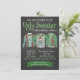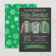 Invitation à une fête de Noël avec trois pulls moches drôles sur un tableau noir et un fond de flocons de neige. Vous pouvez facilement personnaliser ces invitations de fête de Noël au pull moche pour votre événement en ajoutant simplement vos détails.