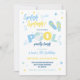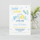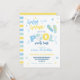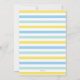 Une invitation à une fête de piscine amusante dans un schéma de couleurs bleu et jaune avec un design rayé au dos. Parfait pour la célébration de l'anniversaire d'un garçon en été !