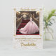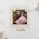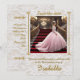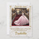 L'image représente une jeune fille Quinceanera posant pour la photo, descendant l'escalier d'un salon de luxe orné de motifs dorés et de lustres. C'est une célébration traditionnelle hispanique pour la jeune fille qui fête ses 15 ans, et elle sera présentée à la société en tant que Mademoiselle.