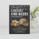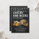 Cartes d'invitation rustiques pour enterrement de vie de garçon avec un fond à effet tableau noir, une sélection de bières à l'aquarelle, un pretzel et un tonneau de bière, des guirlandes lumineuses, et un modèle de fête "cheers and beers" moderne facile à personnaliser.