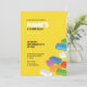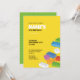 Une invitation à la fête des blocs de construction amusante aux couleurs vives et avec un design de plaque de base verte à l'arrière. Parfait pour toute célébration d'anniversaire d'enfant avec un thème de briques !