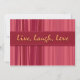 Vivez, riez et aimez lors de votre brunch ou de votre fête de la Fête des Mères avec cette Invitation branchée de la Fête des Mères Pink Striped. Lignes verticales dans les tons roses, violets et rouges de la croix de croupe de style rétro, avec une bannière qui proclame "Live, Laugh, Love" en jaune; le verso dit "Joyeuse fête des mères", et vous pouvez customiser un texte supplémentaire pour un message vraiment personnel. N’oubliez pas les autocollants assortis à l’enveloppe et à la poste!
