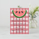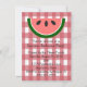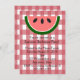 Ce design présente un motif de nappe rouge à damiers et une tranche de pastèque. Pour modifier le style, la taille ou la couleur de la police, cliquez sur le bouton Customiser. Une invitation carré est également disponible pour ce design.