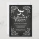 Bats halloween invitation avec un cadre de défilement vintage blanc présentant un trio de chauves-souris avec une typographie moderne "halloween" sur un arrière - plan noir de tableau noir. Retourner notre invitation à dîner d'action de grâce pour voir un retour correspondant pour une touche spéciale supplémentaire. Belle invitation unique pour votre famille et vos amis à la fête d'Halloween.