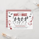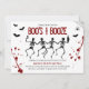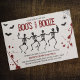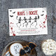 Organiser une fête d'Halloween - Découvrez cette invitation effrayante tachée de sang, qui présente des squelettes dansants ivres, une toile d'araignée et une araignée, des éclaboussures de sang rouge et des chauves-souris noires. Le titre est en lettrage en détresse pour rester dans le thème d'Halloween "les boo's et la boisson" et un modèle moderne facilement personnalisable.