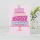 Cette adorable invitation à gâteau d'anniversaire rose pour toute fête d'anniversaire ! Un gâteau d'anniversaire assis sur un stand de gâteau rose avec des rangées de roses, de pois et de violets.