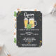 Verre de bière peint, tasse, houblon et blé sur le arrière - plan en tableau noir, Invitation du Nouvel An.