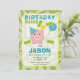 On ne peut pas se tromper avec un peu de vert pour un anniversaire ! Cette invitation présente une tirelire mignonne avec un chapeau de fête et un ballon, agrémentée de billets et de pièces.