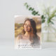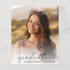 Élégante invitation à la fête de remise des diplômes avec la photo de la grad superposée avec "diplômé" dans un script moderne et leur nom et année de classe dans la simple typographie. Au contraire, ajoutez les détails de la fête principale.