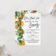 Elégante et moderne invitation à la douche nuptiale orangée.  Ce design est composé d'une tête de calligraphie en forme de pinceau noir et d'un joli arrangement d'agrumes et de fleurs sur le côté ainsi que de points de parties scintillant en or.  Elle a trouvé que sa principale invitation à la douche de mariée sur le thème des agrumes est une façon douce pour les invités invitations de prendre une douche de mariée à venir.