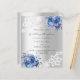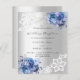 Pour une mariage élégante et romantique. Un arrière - plan à l'aspect faux argenté décoré de fleurs bleues, de roses et de dentelle blanche. Personnalisez et ajoutez vos noms et détails. 1 feuille = 1 invite imprimé bord à bord.