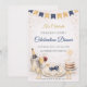 Thème de célébration bleu et or, typographie script, fond neutre doux avec drapeaux de bannière, exposition de champagne, détail de gâteau et éléments de mise en place de table. Conçu pour organiser des dîners formels, des rassemblements marquants ou des célébrations en soirée avec une configuration d'événement raffinée et soignée.