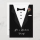 La conception présente l'apparence d'un smoking sur le devant et le texte de l'invitation au dos. Les lettres sont dans une police noire claire sur fond blanc. Rappelez-vous, les mariages ne sont pas juste pour la mariée !