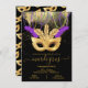 Cartes d'invitation modernes pour une soirée masquée de Mardi Gras en or et violet. Caractéristiques : un masque doré avec des plumes, des perles suspendues et un fond de confettis en poussière d'or. Or faux.