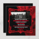 L'invitation présente un thème glaçant avec un cadre rouge sang de style baroque qui encapsule l'essence d'un événement classique de mystère et de meurtre. L'image centrale montre une silhouette de manoir sur fond de ciel sombre et menaçant, suggérant une soirée d'intrigue palpitante. Le contraste du rouge sur fond noir ajoute à l'atmosphère sinistre, promettant une soirée où les invités seront plongés dans un récit suspense qui les poussera à élucider un crime fictif. La police gothique et les arbres ombreux évoquent l'attrait intemporel des histoires de détective, invitant les participants à entrer dans un monde d'énigmes et de secrets dans un grand domaine où chaque coin cache un indice.