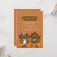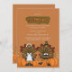 Une invitation humoristique à dîner Thanksgiving avec un couple de dindes vêtu en pèlerins avec un arrière - plan citrouille.