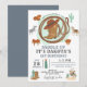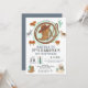 Une invitation de premier anniversaire "saddle up" mignonne et fantaisiste cowboy sauvage ouest en terre cuite brun et blues pour un garçon, avec équipement western cowboy et animaux de ranch. Selle, pilon, chevaux, cactus, selle et lasso. Tout comme cowboy a besoin. C'est son premier rodéo !