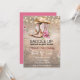 Une cowgirl mignonne et branchée botte l'invitation d'anniversaire pour les filles. Bottes roses avec casquette de cowgirl, arrière - plan rustique en bois foncé et lumières scintillantes.