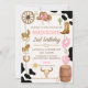Invitation d'anniversaire de Rodeo Cowgirl modifiable. Venez fêter votre anniversaire avec élégance avec cette invitation à l'anniversaire Rodeo Cowgirl! Avec un thème western amusant avec des imprimés de vache, des accents roses, des bottes de cowboy et des graphismes casquettes, c’est parfait pour la journée spéciale de votre petite cowgirl. Personnalisez facilement les détails en utilisant le modèle modifiable. Idéal pour les fêtes d'anniversaire au rodéo, à l'ouest ou à la campagne !
