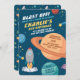 Cette invitation a un design spatial amusant avec des planètes, des étoiles et des roquettes. Idéal pour une fête d'anniversaire thématique espace. Personnalisez avec tous les détails de votre célébration.